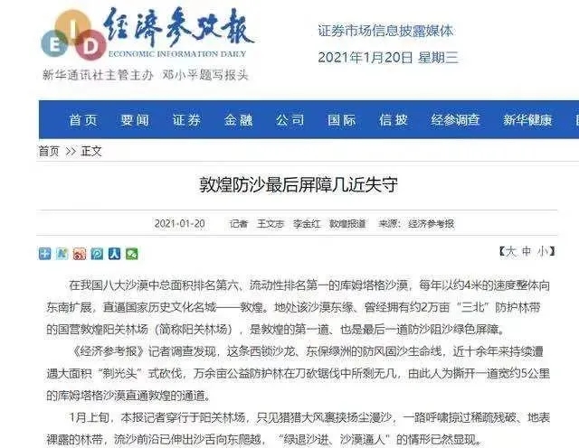 “曾经拥有约2万亩‘三北’防护林带的国营敦煌阳关林场,近10余年来遭遇大面积‘剃光头’式砍伐,万余亩公益防护林在刀砍锯伐中所剩无几,由此人为撕开一道宽约5公里的库姆塔格沙漠直通敦煌的通道……‘西出阳关不见林’,当地人士和相关专家惊呼,任由这道敦煌的阻沙屏障彻底失守,河西走廊西北端将面临一场风沙侵蚀绿洲的生态灾难……”