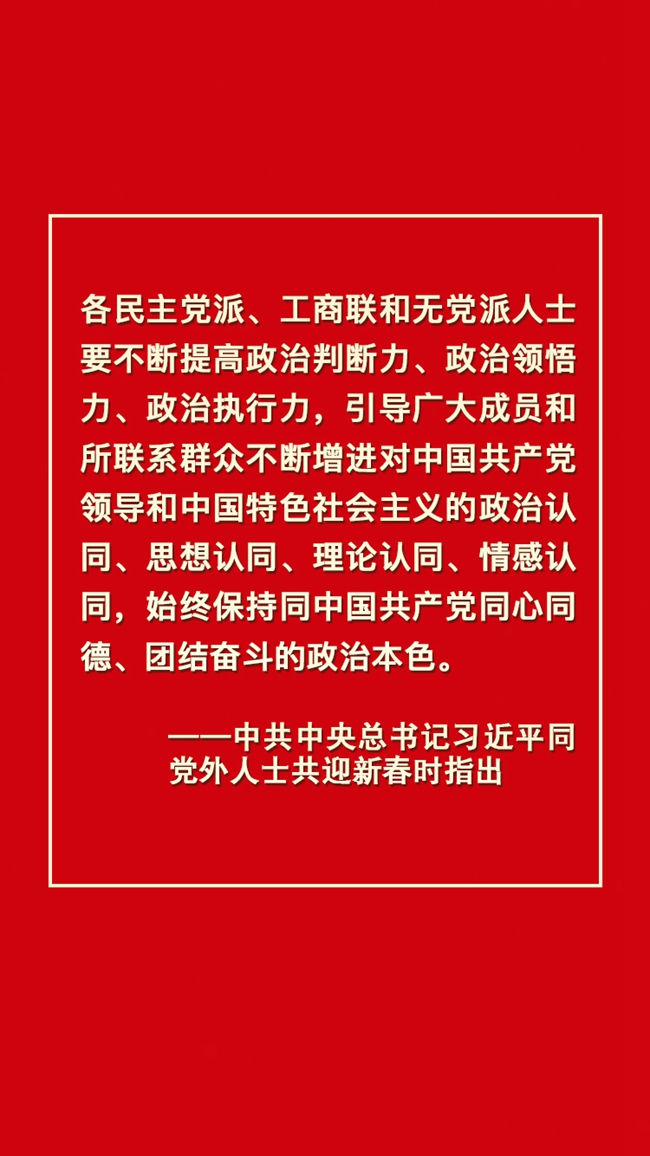 大厦之成,非一木之材也;大海之阔,非一流之归也。把党和人民的事业不断推向前进,离不开中国共产党坚强领导,也需要党外人士发挥优势、贡献力量。以四个“认同”画出最大同心圆,团结一切可以团结的力量,调动一切可以调动的积极因素,我们必将汇聚起共襄伟业的强大力量,同心共筑中华民族伟大复兴的中国梦。(文字:马若虎 海报:邓豪俣)