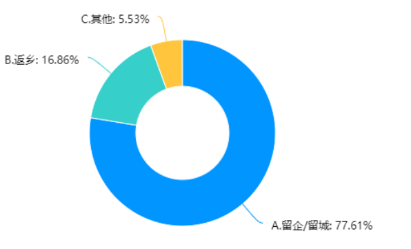 春节是外出打工农民工最重视的假期,往年都是早早筹划返乡过年。今年遇到疫情防控的特殊情况,大多数农民工对就地过年呈现出理性思考。据调查,选择留企或留城就地过年占77.61%(41216人)。