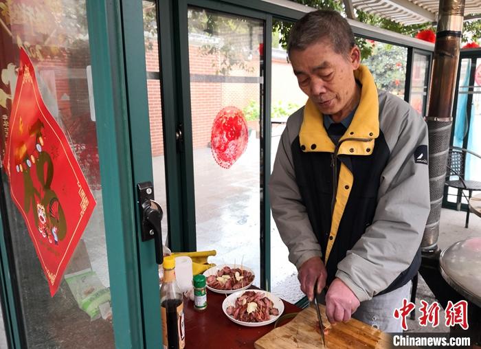 中新社桂林2月16日电 (赵琳露)2月16日,正月初五,留在桂林“就地过年”的台湾同胞邓友兴,带着台湾香肠来到桂林朋友家中拜年。这是年近七旬的邓友兴第一次留在大陆过春节。