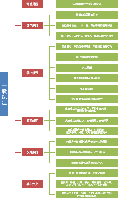 1、 婚姻家庭编的第一章是“一般规定”,共6个条文,是关于婚姻家庭编的总体规定,明确了婚姻家庭编的调整范围、调整婚姻家庭关系的基本原则,明确禁止性规范以及相关的核心定义。特别要指出的是,一般规定中还融入了道德规范,道德观入法是民法典社会主义核心价值观的体现。