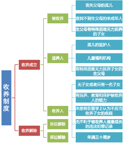 5、 “收养”一章的规定中,包含了收养关系成立和收养关系解除,收养关系成立中涉及了被收养人、送养人和收养人的规定。收养关系解除中明确了协议解除和诉讼解除两种解除方式的规定。