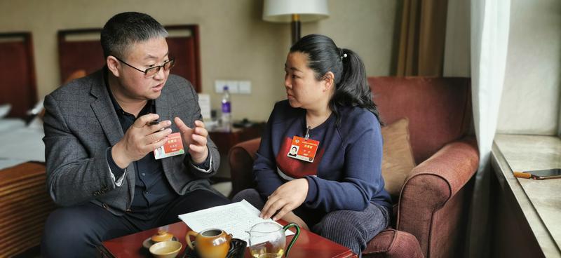 3月3日,青联界别田静委员与马海军委员讨论提案。 特约委员记者田静 摄