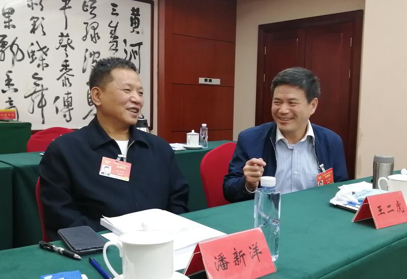 3月9日下午,台盟界别小组会间隙,潘新洋委员(左)与王二虎委员就乡村振兴中如何支持家庭农场高质量发展交换意见。 特邀委员记者 骆沙鸣 摄