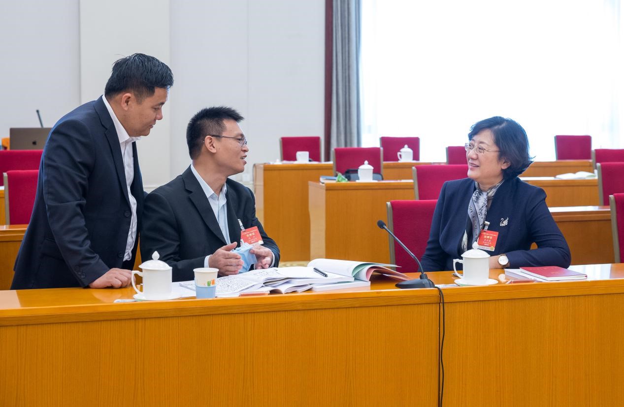 3月7日,海南代表团在住地举行会议,审查预算报告和草案、计划报告和草案。图为会议期间,吕彩霞代表(右)与刘平代表(中)、陈飘代表讨论交流。宋国强 摄
