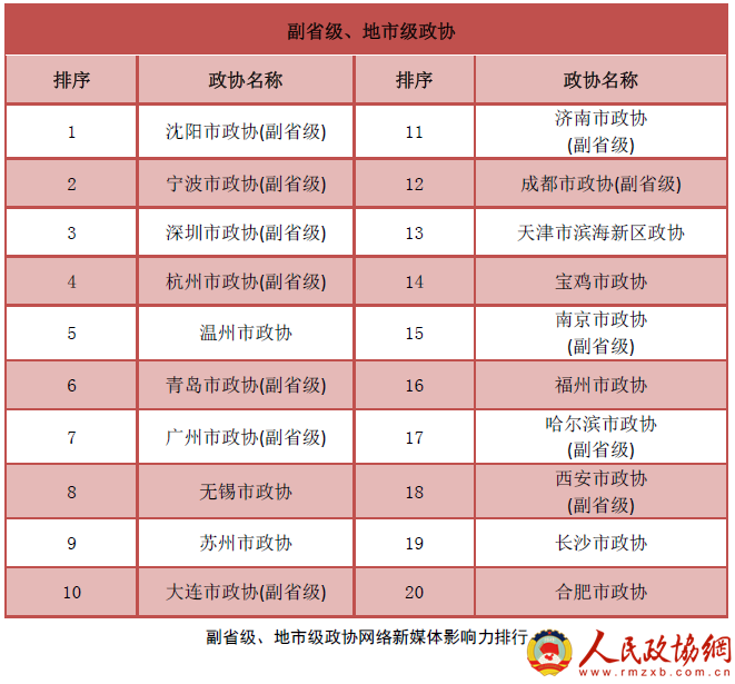 副省级、地市级政协网络新媒体影响力排行:沈阳市、宁波市、深圳市、杭州市、温州市、青岛市、广州市、无锡市、苏州市、大连市、济南市、成都市、天津市滨海新区、宝鸡市、南京市、福州市、哈尔滨市、西安市、长沙市、合肥市。