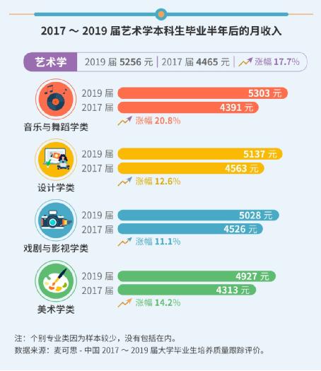 麦可思研究发现,整体而言艺术学本科生在毕业初期月收入(2019届:5256元)并不高,低于全国本科平均水平(5440元),但近几年差距正在逐渐缩小。尤其以音乐与舞蹈学类专业毕业生月收入增长最为明显,2019届(5303元)较2017届提升20.8%。这可能与近年来中小学课外艺术教育培训需求旺盛有关。