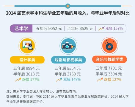 麦可思研究发现,艺术学本科生初入职场近七成从事了和专业相关的工作,音乐与舞蹈、美术类专业多从事培训、教育类工作,设计类专业毕业五年后收入近万元。创业热情高是艺术学毕业生的一大特点,2014届艺术学本科生毕业五年后超过1/10选择自主创业。更多内容详见下文。