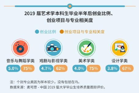 创业热情高是艺术学毕业生的一大特点。麦可思数据显示,2019届艺术学本科生中,毕业半年后有4.5%的人选择自主创业,比本科平均水平(1.6%)高出2.9个百分点。