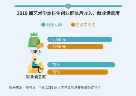 那么创业是否真的能获得更高的收入呢?从数据来看,2019届艺术学本科生中创业群体的月收入(6060元)的确更高。而且或许由于工作充满激情,自主性和灵活性相对较好,创业者的就业幸福感也更强(78%)。