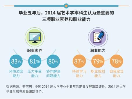 已有多年工作经验的2014届艺术学本科生表示,环境适应能力、压力承受能力、协作解决问题能力,以及持续学习能力、职业规划能力、自我定位能力是最为重要的职业素养和职业能力。所以建议艺术类专业学生在读期间除了精进专业学习,也要注重相关职业能力、素养的提升。同样,为了毕业生更好的职场发展,高校在艺术人才培养中也需在这些方面给予更多重视。