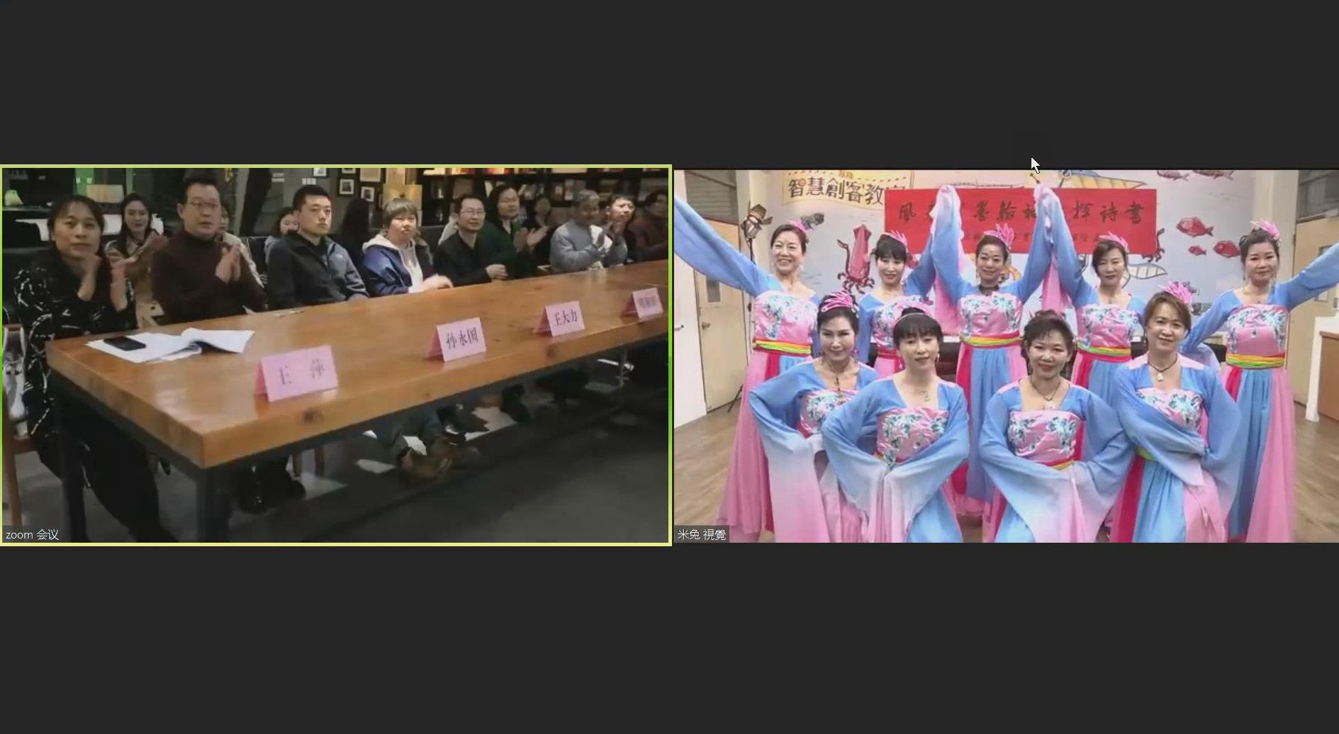 美好的时光总是短暂的,两个多小时的交流互动,其乐融融,两地书画朋友们共襄盛举,畅叙情谊,突出了书画艺文交流的特色和“两岸一家亲”的浓浓情谊,传承了中华民族传统文化的精髓,体现了两岸共同的精神和价值追求,进一步增进了文化认同和心灵契合?;疃采?,两岸艺术家和老师们共同唱响《龙的传人》,共同祝愿民族复兴、祖国繁荣。相约疫情之后尽快互访,再叙友情,为两岸融合发展贡献力量。
