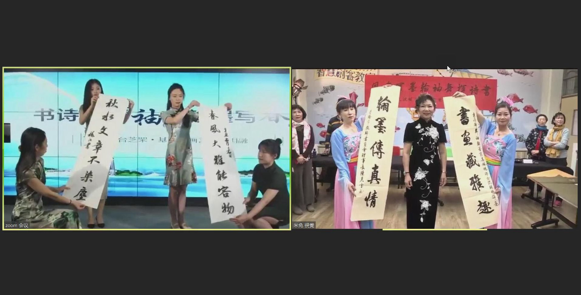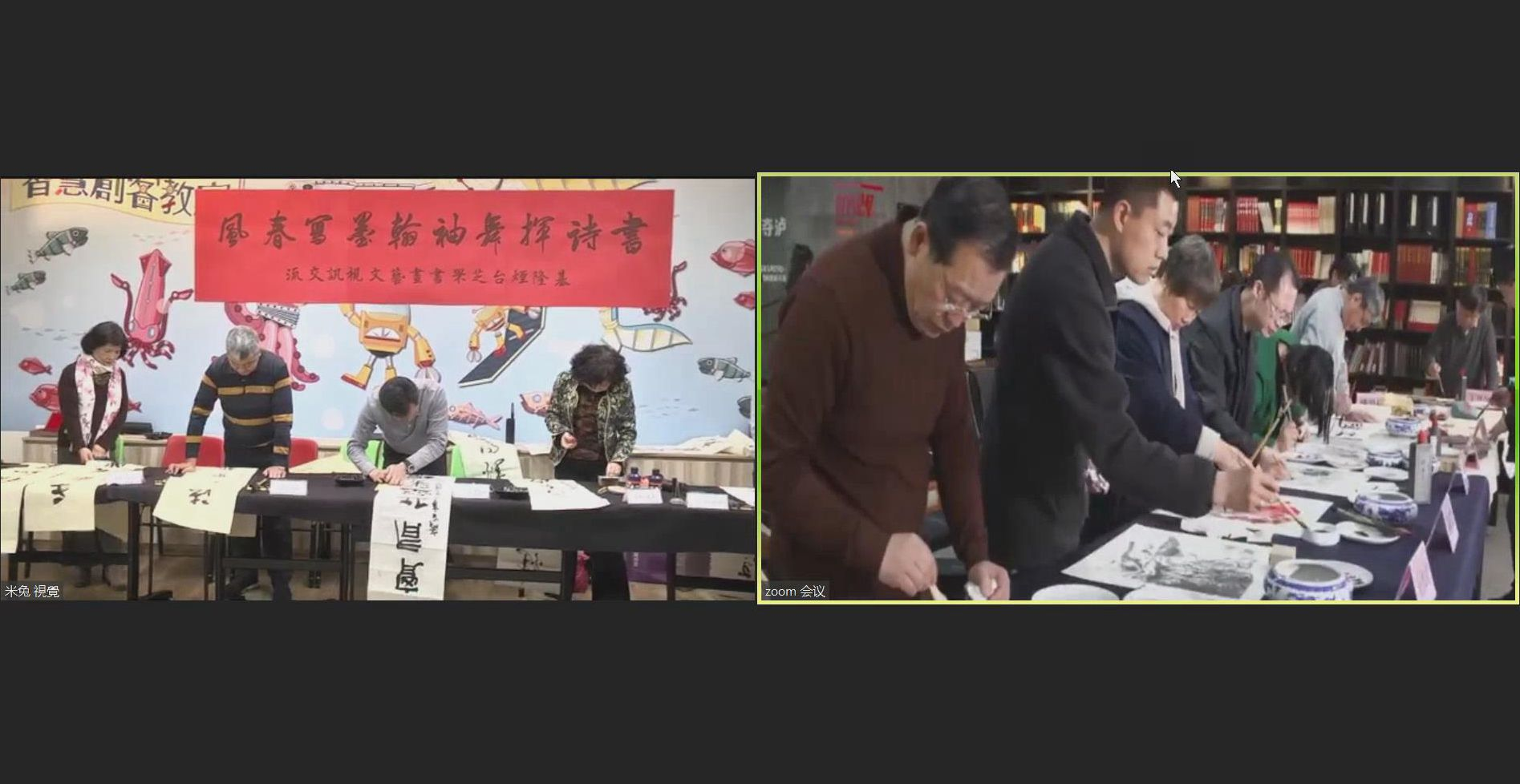 两地书画界老友新朋通过视讯形式,切磋技艺,互致问候。