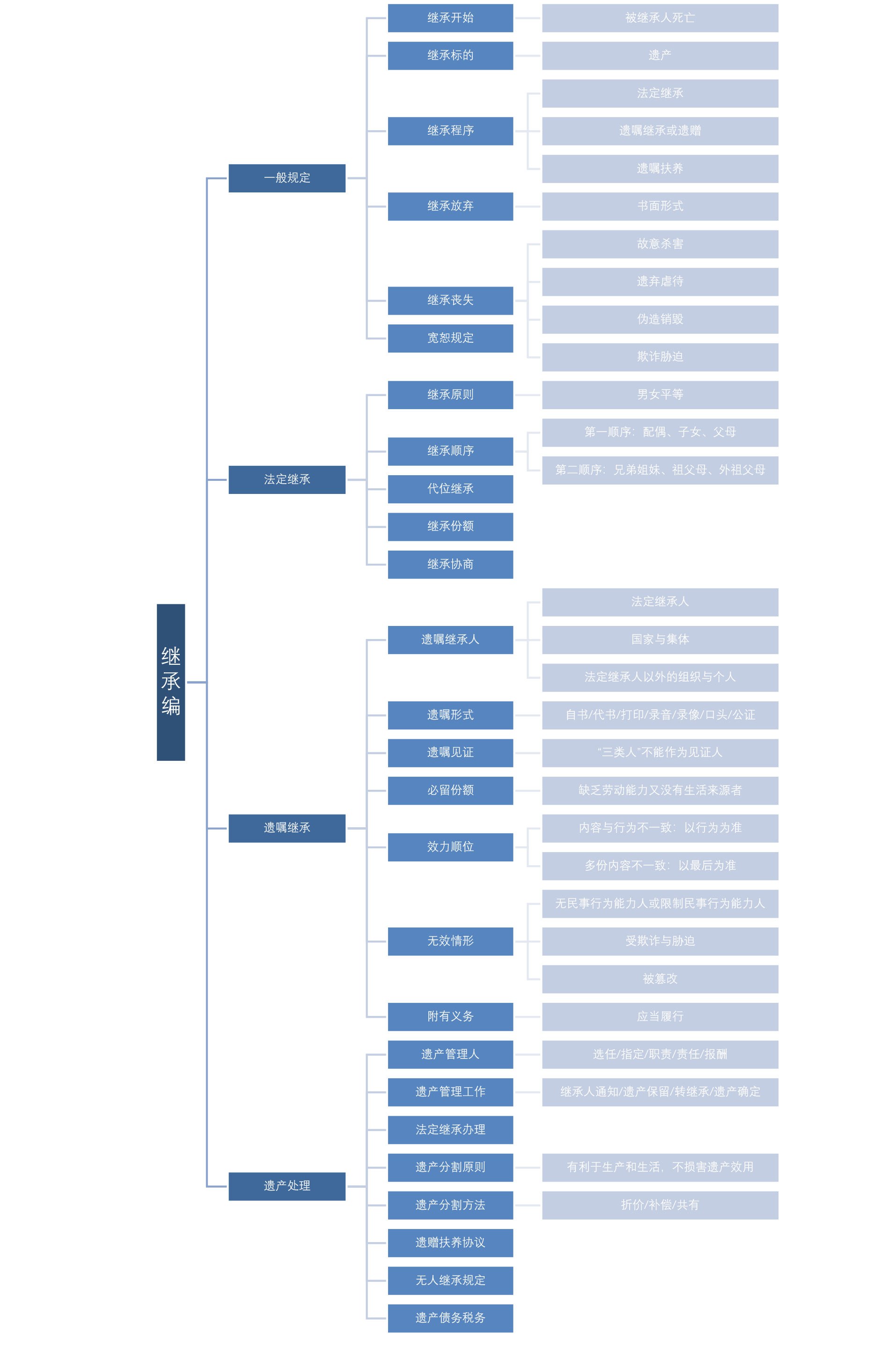 民法典继承编共四章45条?!耙话愎娑ā币徽轮饕娑思坛腥?、继承时间、遗产、继承的接受与放弃、继承权的丧失与宽恕等内容?!胺ǘ坛小币徽露远苑ǘ坛腥说姆段в爰坛械乃承?、代位继承、姻亲继承、分配份额、酌定分配、遗产处理方式等内容进行规定?!耙胖黾坛泻鸵旁币徽露砸胖?、自书遗嘱、代书遗嘱、打印遗嘱、录音录像遗嘱、公证遗嘱、遗嘱见证人、遗嘱撤回、遗嘱无效等内容进行规定。“遗产的处理”一章,对遗嘱执行人、遗产管理人、转继承、析产、胎儿继承权、遗产分割、遗产负债限额等内容进行规定。