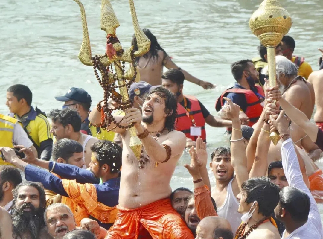 ▲4月14日,在印度北阿肯德邦的赫里德瓦尔,民众在恒河下水沐浴庆?!按蠛凇?。(新华社发)