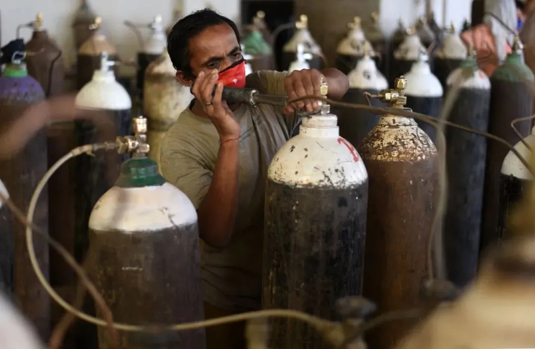 ▲4月19日,工作人员在印度普拉亚格拉杰为医用氧气罐充氧。(新华社发)