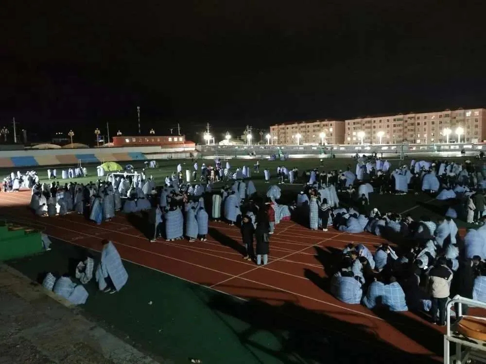 5月22日凌晨,在青海省果洛藏族自治州州府玛沁县,果洛州民族高级中学的学生在操场避险。