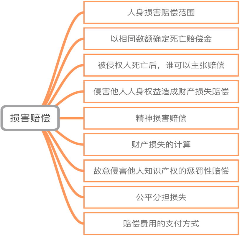 民法典侵权责任编第二章“损害赔偿”的相关规定,在原侵权责任法第二章“责任构成和责任方式”的基础上编纂形成,共包含9个条文。规定了对人身损害赔偿范围,以相同数额确定死亡赔偿金,被侵权人死亡后、谁可以主张赔偿,侵害人身权益造成财产损失的赔偿,精神损害赔偿,财产损失的计算方式,故意侵害他人知识产权的惩罚性赔偿,公平分担损失以及赔偿费用的支付方式等内容。(见下图)