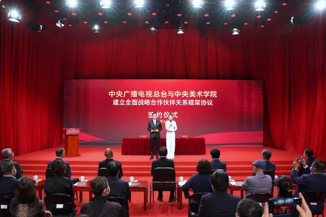 中央广播电视总台编务会议成员朱彤、黄传芳、王晓真及总台相关部门负责人,中央美术学院党委副书记王晓琳、副院长吕品晶以及相关部门、院系负责人参加签约活动。