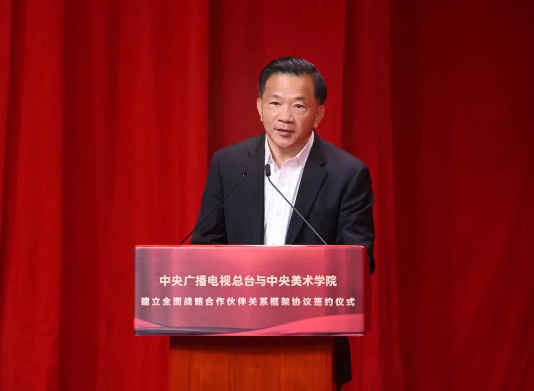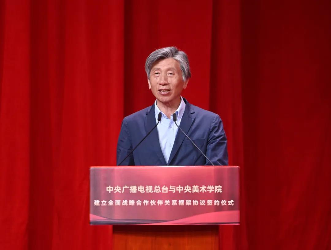 范迪安在致辞中表示,中央广播电视总台和中央美术学院正式建立全面战略合作伙伴关系,开启全新的合作平台,是一项强强联合的创举,是促进中央美术学院学科建设、艺术创作科研、提高服务社会能力的新动力。双方将共同推动美术创作与文化传播的深度融合,推进产学研深度合作,加快推进媒体深度融合发展,为以美为媒,加强国际传播能力建设贡献力量,共同承担起举旗帜、聚民心、育新人、兴文化、展形象的使命任务。