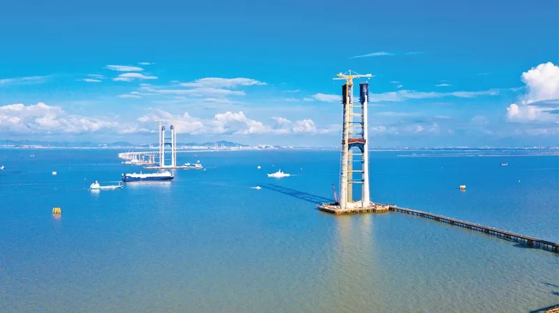 广东坚持把基础设施互联互通作为城市群建设的先导工程,加快推进“轨道上的大湾区”和跨境基础设施建设。深中通道是联系珠江口东西两岸的直联通道,是粤港澳大湾区的又一重要交通大动脉。图为2021年5月16日,深圳深中通道伶仃洋大桥270米主塔建设正在进行中。 人民图片 吴宙/摄