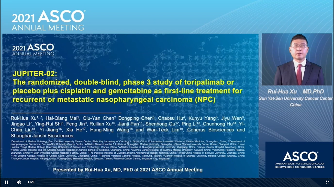 徐瑞华教授在(ASCO)年会汇报的主题是《JUPITER-02:一项比较特瑞普利单抗或安慰剂联合吉西他滨和顺铂一线治疗复发或转移性鼻咽癌的随机、双盲、Ⅲ期临床研究》,他也是这项研究的首席科学家。