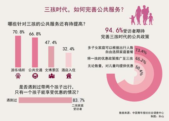 调查中,94.6%的受访者期待完善三孩时代的公共服务。具体说来,73.4%的受访者希望多子女家庭可以根据出行人数自由选择家庭套餐,65.2%的受访者建议将一孩的优惠政策推广至三孩,50.4%的受访者希望无论数量,对儿童均提供优惠。