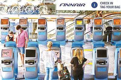 芬兰21日起放宽新冠疫情下的入境限制。图为旅客在芬兰赫尔辛基机场办理自助值机手续 供图/新华社