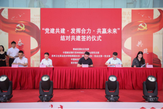 活动现场还开展了结对共建仪式,香城花园社区党委与中国建设银行苏州相城支行营业部党支部、中共苏州卫生职业技术学院眼视光系(眼视光医院)党总支第一党支部、邮储银行相城支行、南京银行苏州相城支行,御苑家园社区党委与苏州市相城文商旅发展(集团)有限公司、华润万家生活超市(浙江)有限公司苏州阳澄湖西路店、苏州宇祺教育管理咨询有限公司党支部签署了共建合作协议。双方将在党组织建设、党员教育等方面实现资源共享、优势互补,提升双方党组织的创造力、凝聚力和战斗力,构建起优势互补、信息互联、工作互动的共建新格局。
