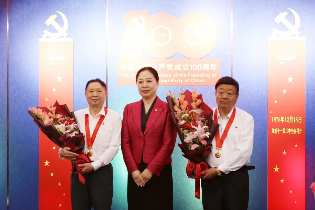 杨娅辉为“光荣在党50年”的老党员代表佩戴纪念章,向他们致以崇高的敬意,并将“同心向党 致敬百年”政治生日贺卡送到了老中青党员手中。