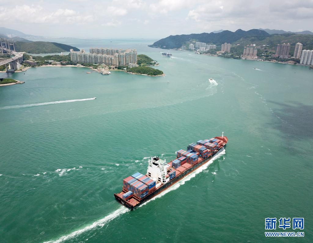 香港汀九桥附近,一艘货轮驶向码头(6月11日,无人机照片)。(新华社记者 李钢 摄)