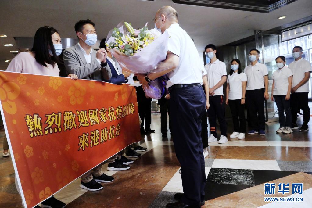 香港市民代表在香港九龙维景酒店欢迎内地核酸检测支援队抵港(2020年8月21日摄)。(新华社记者 王申 摄)