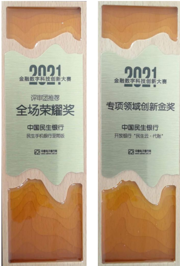 7月9日,由中国金融认证中心(CFCA)和中国电子银行联合宣传年主办的“2021中国金融数字科技创新大赛”结果揭晓,民生手机银行至简版荣获“全场荣耀奖”、开放银行“民生云·代账”荣获“专项领域创新金奖”。