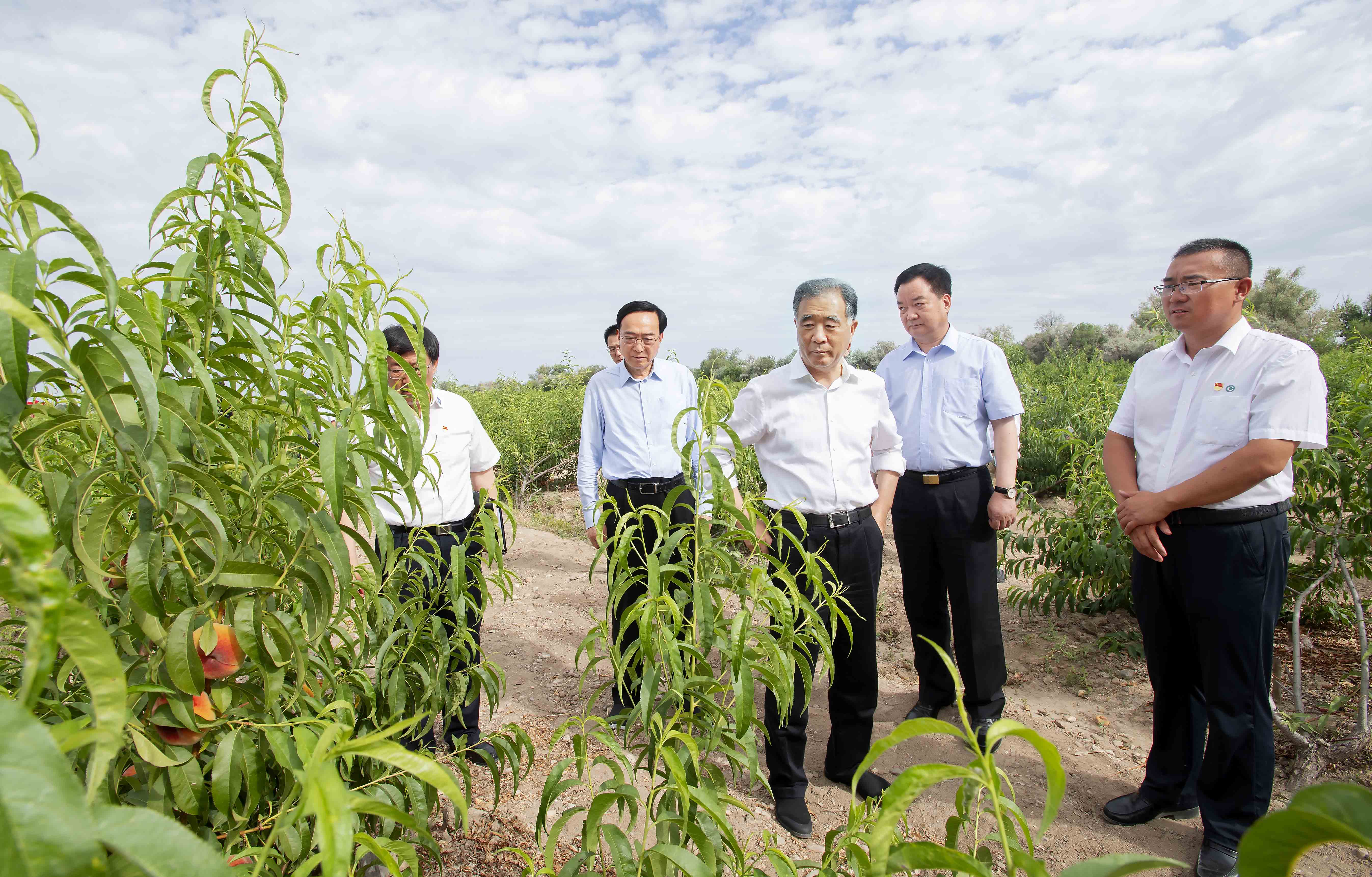 7月21日至24日,中共中央政治局常委、全国政协主席汪洋在新疆调研兵团工作。这是23日,汪洋在兵团十师北屯市千亩桃园了解果树长势。新华社记者 李涛 摄