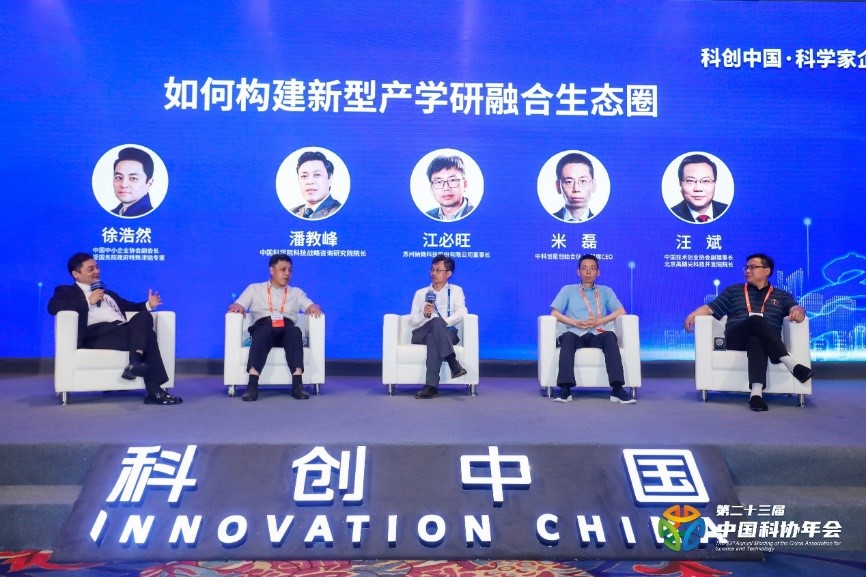 在题为“如何构建新型产学研融合生态圈”的对话中,中国科学院科技战略咨询研究院院长潘教峰,苏州纳微科技股份有限公司董事长江必旺,中科创星创始合伙人、联席CEO米磊,中国技术创业协会副理事长、北京高精尖科技开发院院长汪斌四位嘉宾围绕话题各抒己见。