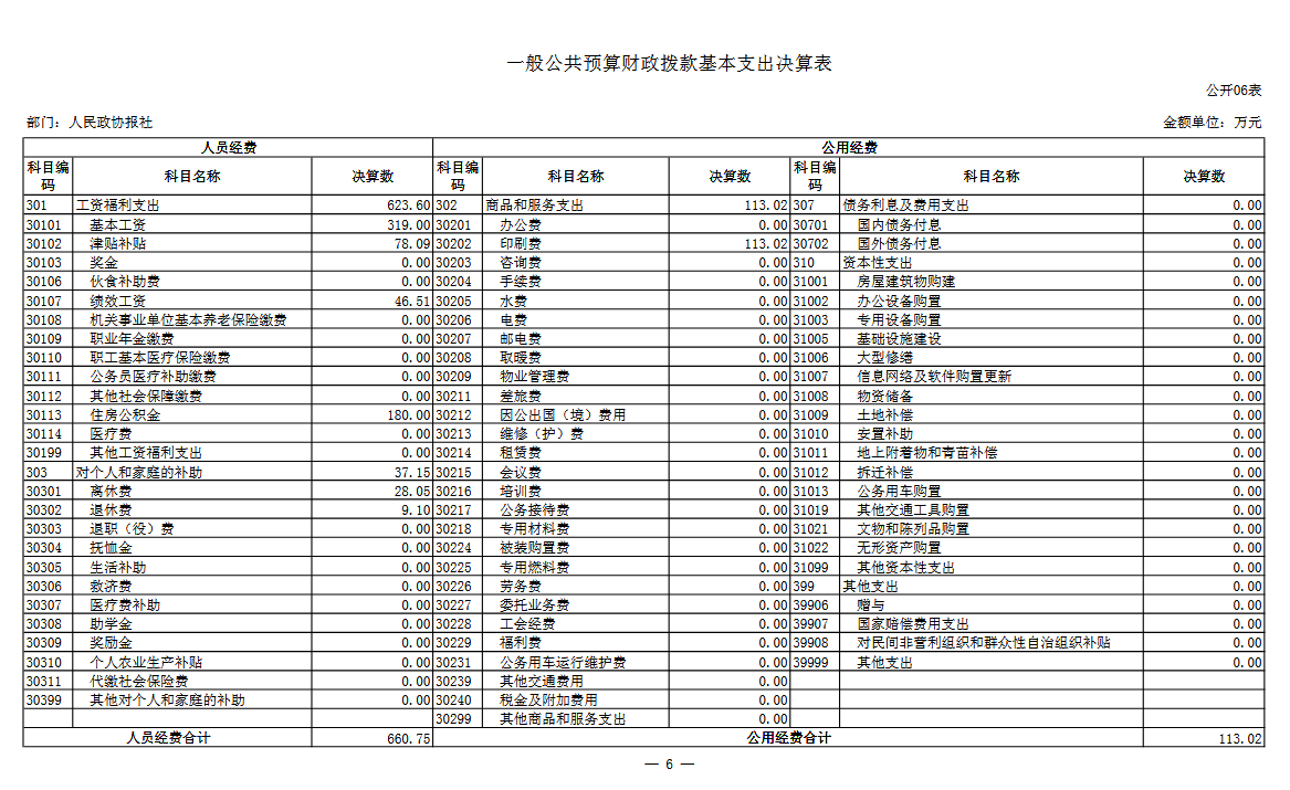 2020年度财政拨款基本支出773.77万元。其中人员经费660.75万元,主要包括:基本工资、津贴补贴、绩效工资、住房公积金、离休费、退休费;公用经费113.02万元,为印刷费。