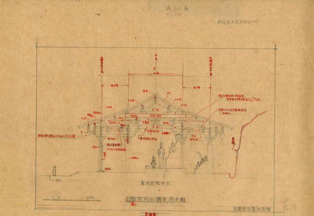 在第二单元“书写中国建筑史与破译天书”中,介绍了作为中国建筑史学科的重要奠基人之一的梁思成,在20世纪30至40年代期间通过广泛的田野调查和深入的研究,构架中国建筑史研究体系的生动历程。蓟县独乐寺观音阁南立面的水彩渲染图精准而详实,佛光寺大殿测绘图纸,现场影像资料,以及应县木塔手稿原件等一大批珍贵资料悉数亮相。梁思成极为重视古建筑测绘,他在1933年9月测绘应县木塔时曾不顾生命安危徒手攀援铁链测绘塔刹。他与助手莫宗江合作的一系列古建筑测绘图,成为迄今无人超越的典范。