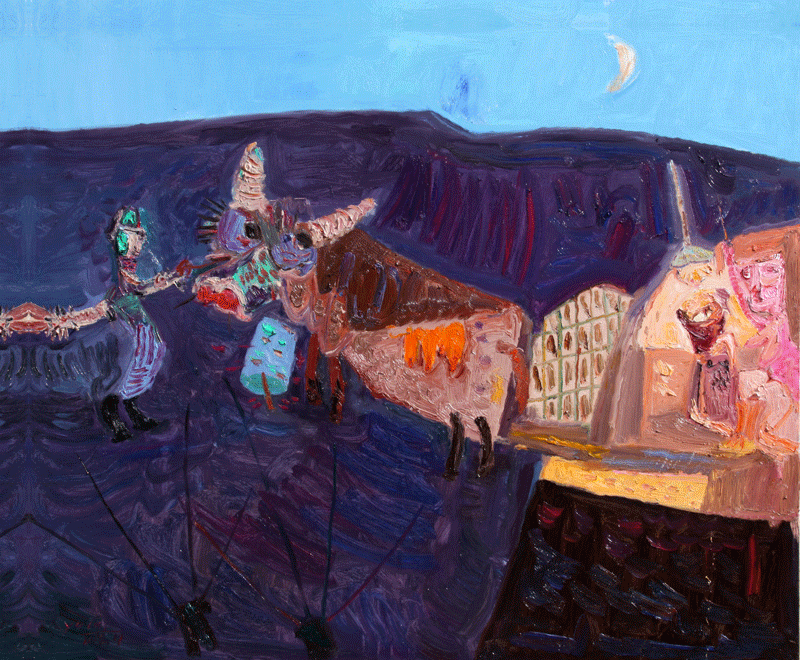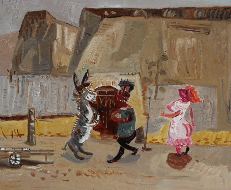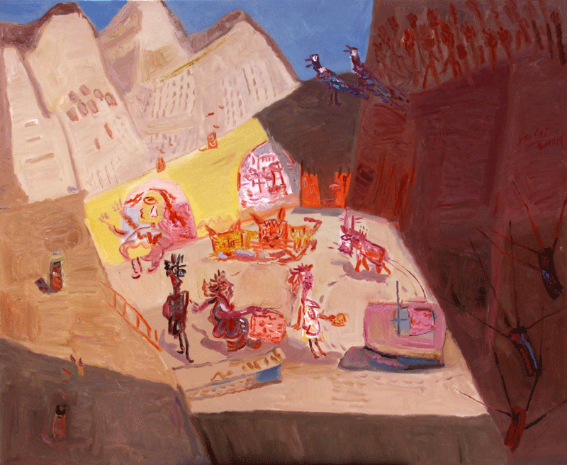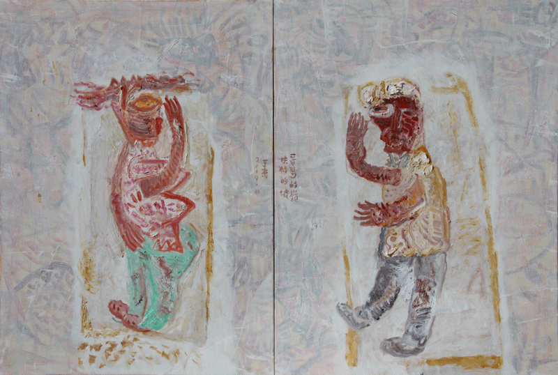 最近几年,于来的绘画更倾向于对社会景观的表现。他借鉴西方绘画中的表现主义,以抽象的艺术符号为载体,集物象、风情于一体,具有浓郁的浪漫主义特点,是真情实感的流露,也是对美好生活的向往;是生命激情的绽放,也是主观情感的形式外化。每幅作品都以隐喻的方式讲述着一个个生动有趣的小故事,是高原本真人性和日常生活的真实再现。就连作品的题目,经于来用心推敲,也朴实含蓄而意味深远。作品《挠痒痒》,一对雕塑般的男女形象充斥了整个画面,就像浸过陕北民歌的厚土。他们之间纯真质朴的爱情没有??菔?,也不需要海誓山盟,因为有风可证,有峁梁可证,有窑洞里的小狮子可证。作品《信天游》,一对骑着毛驴的男女置身于风雪肆虐过的千山万壑中,男人哼唱着高亢而奔放的信天游,女人在驴背上欢快地手舞足蹈,表现了与风同游、和土共舞的高原生活。于来以强烈而富有动感的旋律和笔触、夸张变形的客体描绘,传达了轻松乐观的主情调,讴歌了黄土高原上万物生灵坚韧的性格和顽强的生命力,这也正是他“黄土高原”系列绘画的价值所在。