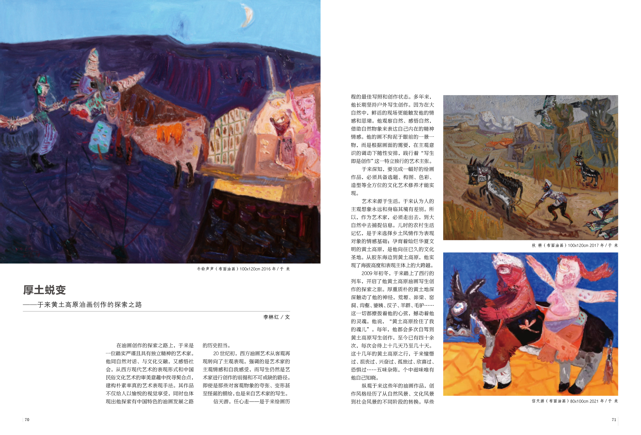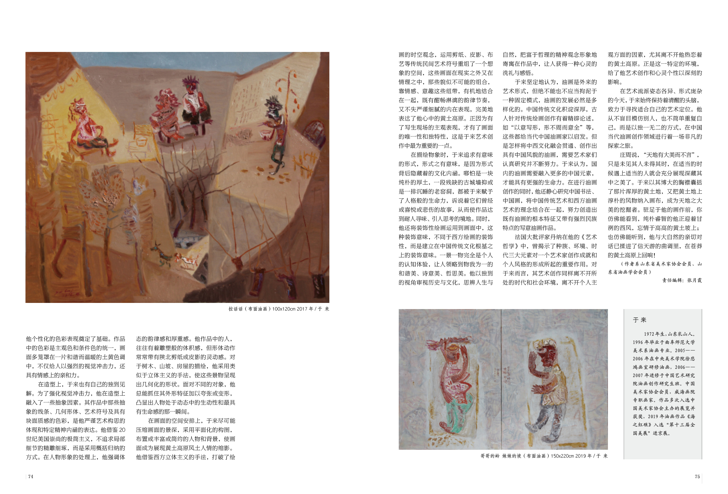 在油画创作的探索之路上,于来是一位踏实严谨且具有独立精神的艺术家。他同自然对话、与文化交融,又感悟社会,从西方现代艺术的表现形式和中国民俗文化艺术的审美意趣中找寻契合点,建构朴素率真的艺术表现手法。其作品不仅给人以愉悦的视觉享受,同时也体现出他探索有中国特色的油画发展之路的历史担当。