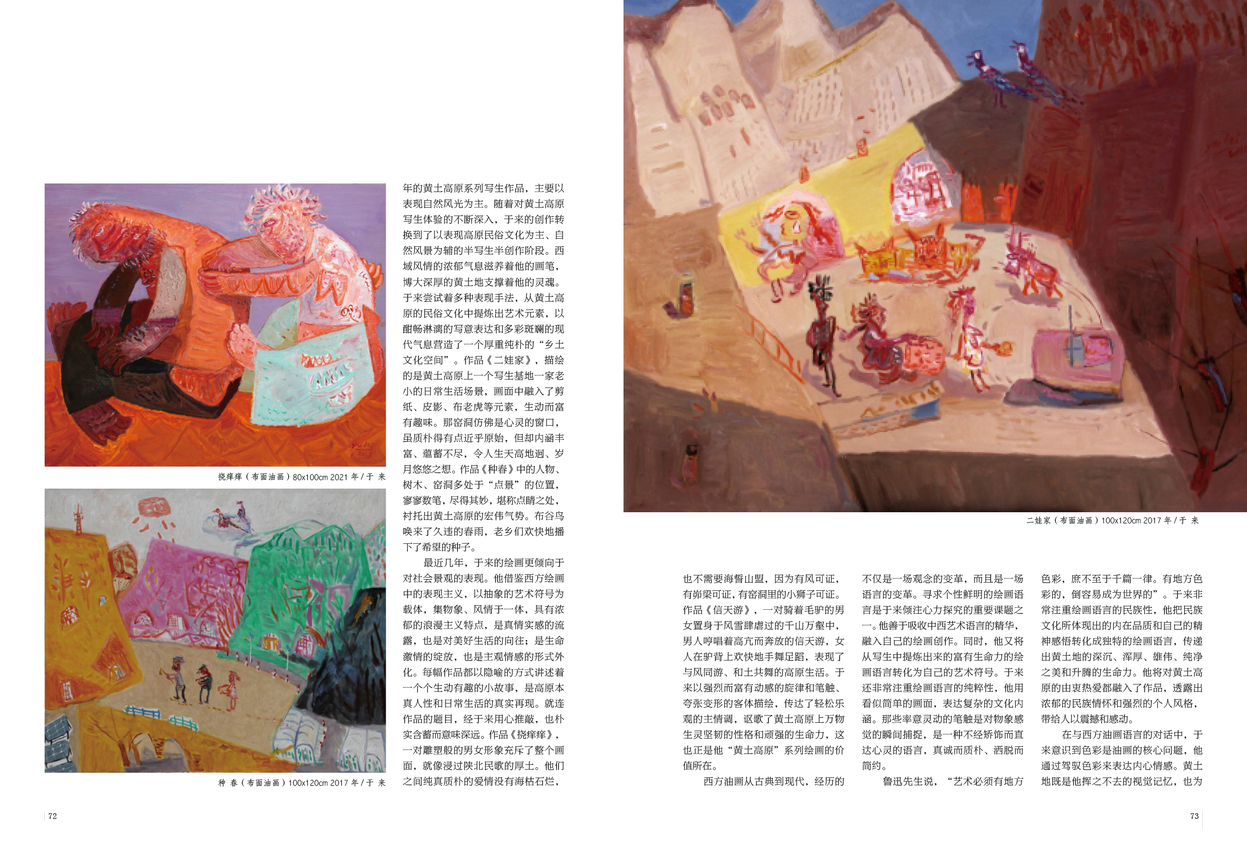 纵观于来这些年的油画作品,创作风格经历了从自然风景、文化风景到社会风景的不同阶段的转换。早些年的黄土高原系列写生作品,主要以表现自然风光为主。随着对黄土高原写生体验的不断深入,于来的创作转换到了以表现高原民俗文化为主、自然风景为辅的半写生半创作阶段。西域风情的浓郁气息滋养着他的画笔,博大深厚的黄土地支撑着他的灵魂。于来尝试着多种表现手法,从黄土高原的民俗文化中提炼出艺术元素,以酣畅淋漓的写意表达和多彩斑斓的现代气息营造了一个厚重纯朴的“乡土文化空间”。作品《二娃家》,描绘的是黄土高原上一个写生基地一家老小的日常生活场景,画面中融入了剪纸、皮影、布老虎等元素,生动而富有趣味。那窑洞仿佛是心灵的窗口,虽质朴得有点近乎原始,但却内涵丰富、蕴蓄不尽,令人生天高地迥、岁月悠悠之想。作品《种春》中的人物、树木、窑洞多处于“点景”的位置,寥寥数笔,尽得其妙,堪称点睛之处,衬托出黄土高原的宏伟气势。布谷鸟唤来了久违的春雨,老乡们欢快地播下了希望的种子。