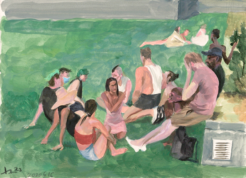 众人在纽约哈德逊河边-(纸上水彩)26x36cm2020年-刘小东