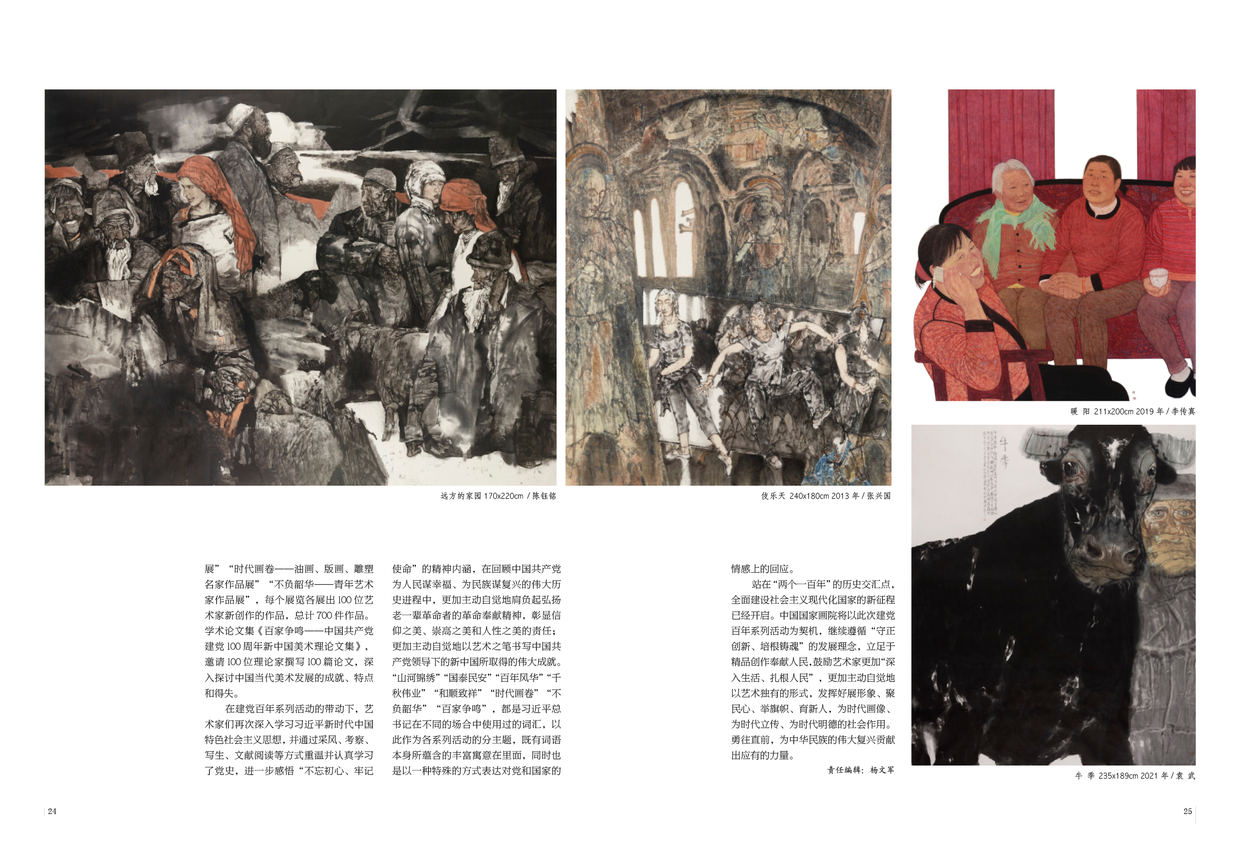 在建党百年系列活动的带动下,艺术家们再次深入学习习近平新时代中国特色社会主义思想,并通过采风、考察、写生、文献阅读等方式重温并认真学习了党史,进一步感悟“不忘初心、牢记使命”的精神内涵,在回顾中国共产党为人民谋幸福、为民族谋复兴的伟大历史进程中,更加主动自觉地肩负起弘扬老一辈革命者的革命奉献精神,彰显信仰之美、崇高之美和人性之美的责任;更加主动自觉地以艺术之笔书写中国共产党领导下的新中国所取得的伟大成就?!吧胶咏跣濉薄肮┟癜病薄鞍倌攴缁薄扒镂耙怠薄昂退持孪椤薄笆贝怼薄安桓荷鼗薄鞍偌艺保际窍敖阶苁榧窃诓煌某『现惺褂霉拇驶?,以此作为各系列活动的分主题,既有词语本身所蕴含的丰富寓意在里面,同时也是以一种特殊的方式表达对党和国家的情感上的回应。