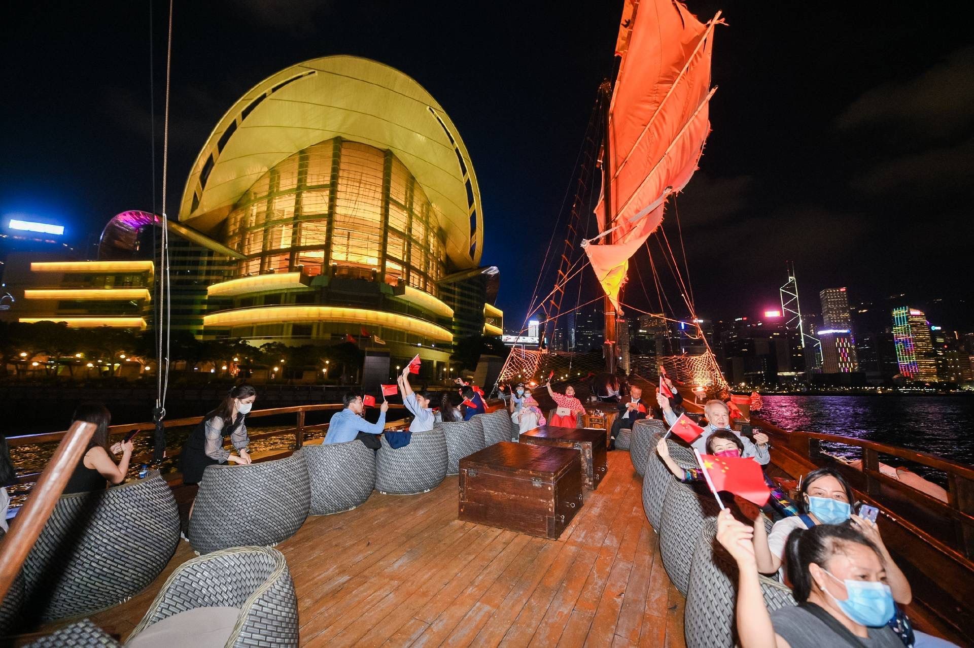 中式古董帆船“鸭灵号”“张保仔号”及大型观光船“洋紫荆号”挂上红旗和标语在维多利亚港穿梭
