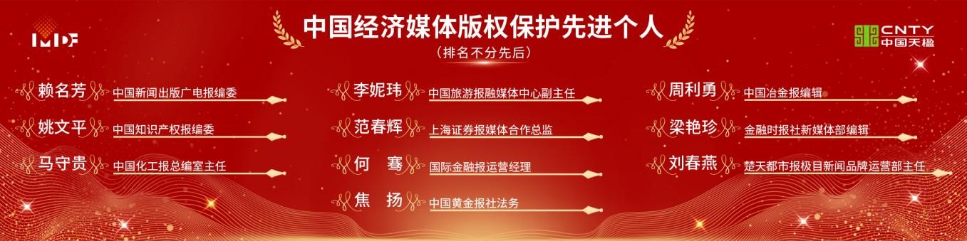 获得版权?;は冉鋈私保ㄅ琶环窒群螅┑挠校褐泄挛懦霭婀愕绫ū辔得?、中国知识产权报编委姚文平、中国化工报总编室主任马守贵、中国旅游报融媒体中心副主任李妮玮、上海证券报媒体合作总监范春辉、国际金融报运营经理何骞、中国黄金报社法务焦扬、中国冶金报编辑周利勇、金融时报社新媒体部编辑梁艳珍、楚天都市报极目新闻品牌运营部主任刘春燕等10人。