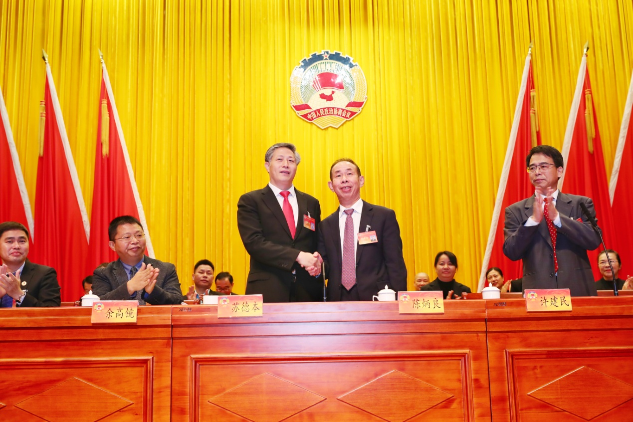 厦门市思明区政协九届一次会议第二次全体会议上,区政协原主席陈炳良(右)与新当选的区政协主席苏德本 (左)与亲切握手,表示祝贺