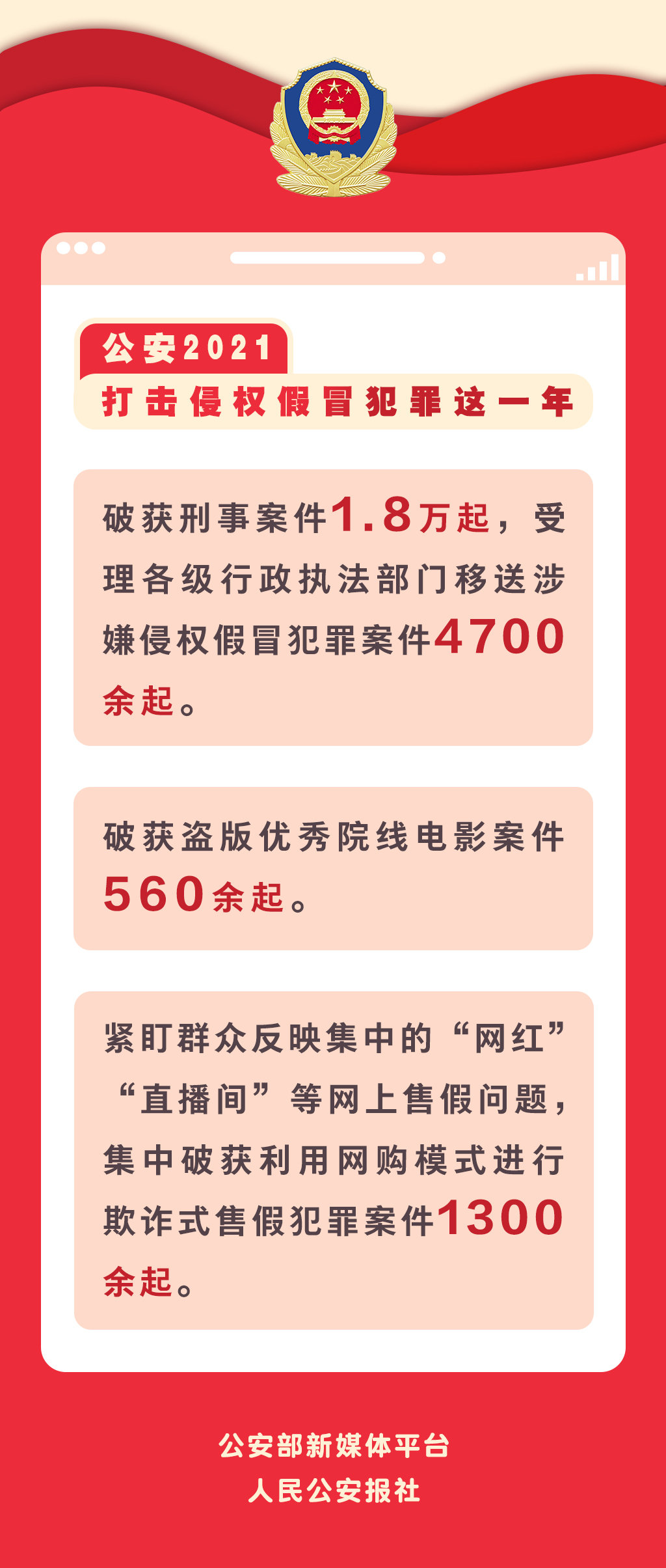 人民政协网北京1月5日电(记者 牛忠磊)记者5日从公安部获悉,2021年,全国公安机关深入开展“昆仑2021”专项行动,依法严打侵犯知识产权和制售假冒伪劣商品犯罪,取得显著战果。