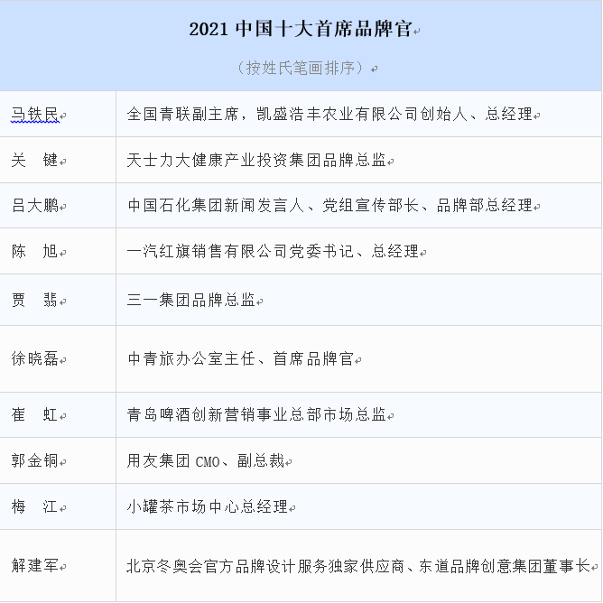 随后,《2021中国十大首席品牌官》榜单发布。10位国内知名企业的品牌掌门人入选了榜单,他们分别是马铁民、吕大鹏、关键、陈旭、贾翡、徐晓磊、崔虹、郭金铜、梅江、解建军。