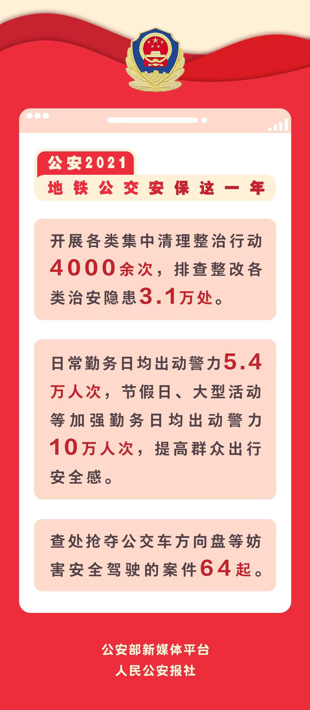 人民政协网北京1月6日电(记者 牛忠磊)2021年,各地公安机关地铁公交安保部门围绕影响群众反映强烈的公共交通出行安全问题,积极开展地铁公交及周边风险隐患专项排查整治,全面加强地铁公交安全防控能力,确保人民群众安全便捷出行。