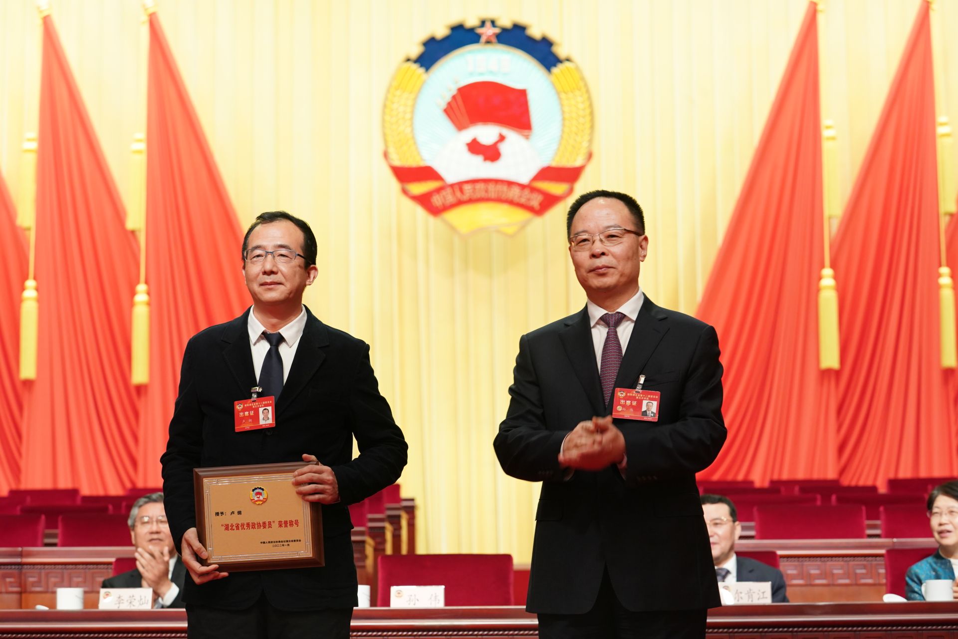 湖北省政协主席孙伟在今年湖北两会上为卢纲委员颁奖