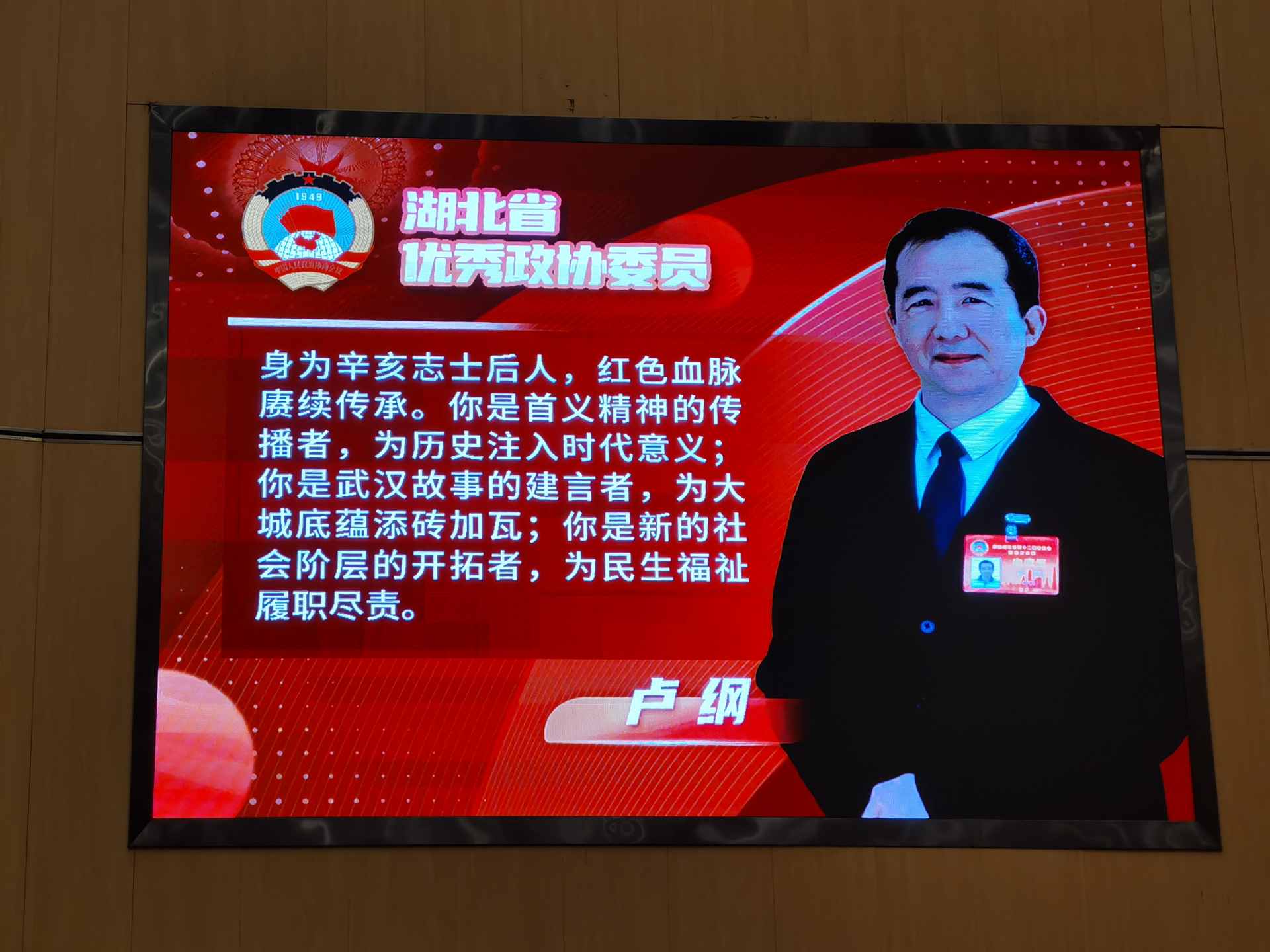 洪山礼堂湖北两会大会现场大屏幕上卢纲的获奖照片